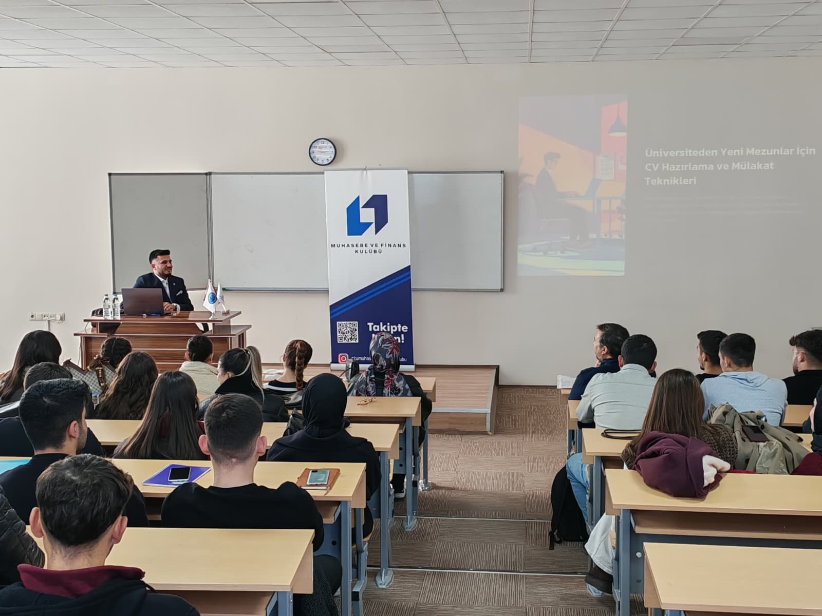 Fakültemiz Muhasebe ve Finans Yönetimi Bölümü 2022 mezunu, Stajyer SMMM ve Asri Fikir Cemiyeti Başkanı Sn. Ahmet AKYOL, Muhasebe ve Finans Kulübü tarafından düzenlenen “Muhasebe ve Finans Alanı İçin Mülakat Teknikleri ve Özgeçmiş Hazırlama” söyleşiye konuşmacı olarak katılmıştır.